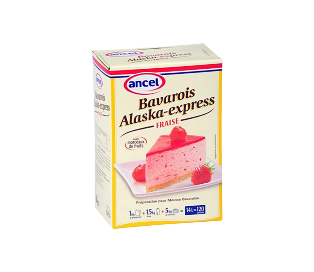 Dosage standard : 200 g de préparation pour Bavarois Alaska-express + 300 g d’eau à 25-30°C + 1000 g de Chantilly sucrée de 50 à 100 g par litre de chantilly.