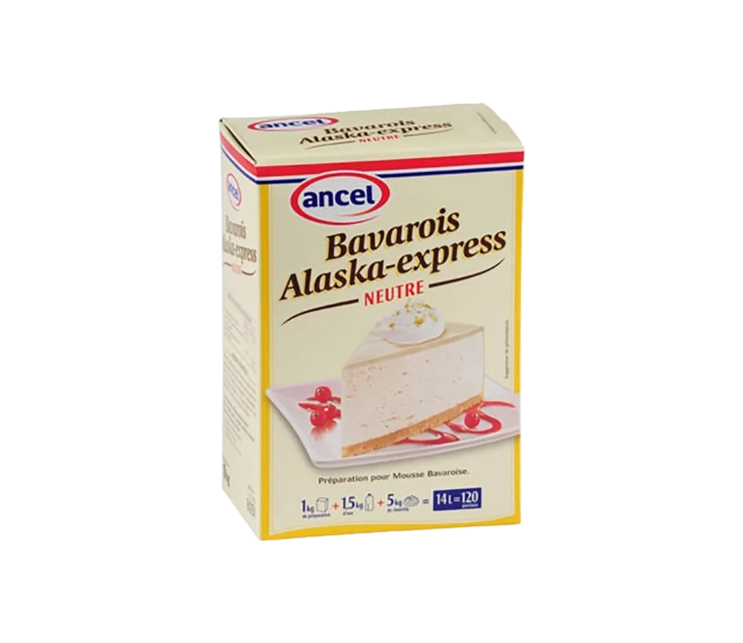Dosage sur base purée de fruits : 300 g de préparation pour Bavarois Alaska-express Neutre + 1000 g Chantilly sucrée jusqu’à 150g/litre selon utilisation + 800 g de purée de fruits.