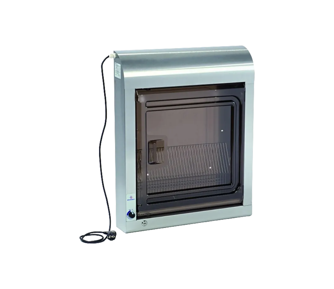 Armoire de décontamination Pour couteaux et petits ustensiles. Le rayonnement UV émis par le tube germicide exerce une action photochimique décontaminante. Tube a ballast électronique 15 watts, longue durée de vie (8000H) assurant une réduction de 25% de la consommation électrique. Carrosserie acier inoxydable. Porte transparente fumée, avec interrupteur de sécurité. Fermeture magnétique avec serrure. Fixation murale, visserie inox fournie. 230V monophasé. Puissance 18 watts.