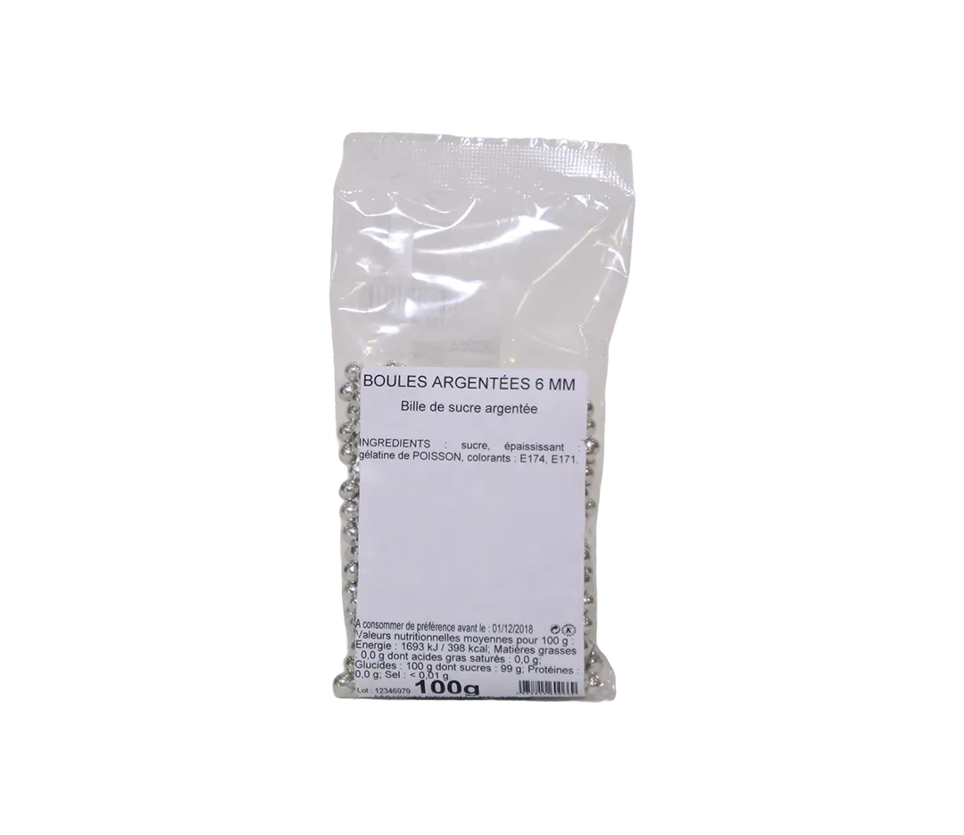 Ingrédients : sucre, épaississant : gélatine de POISSON, colorant : argent.