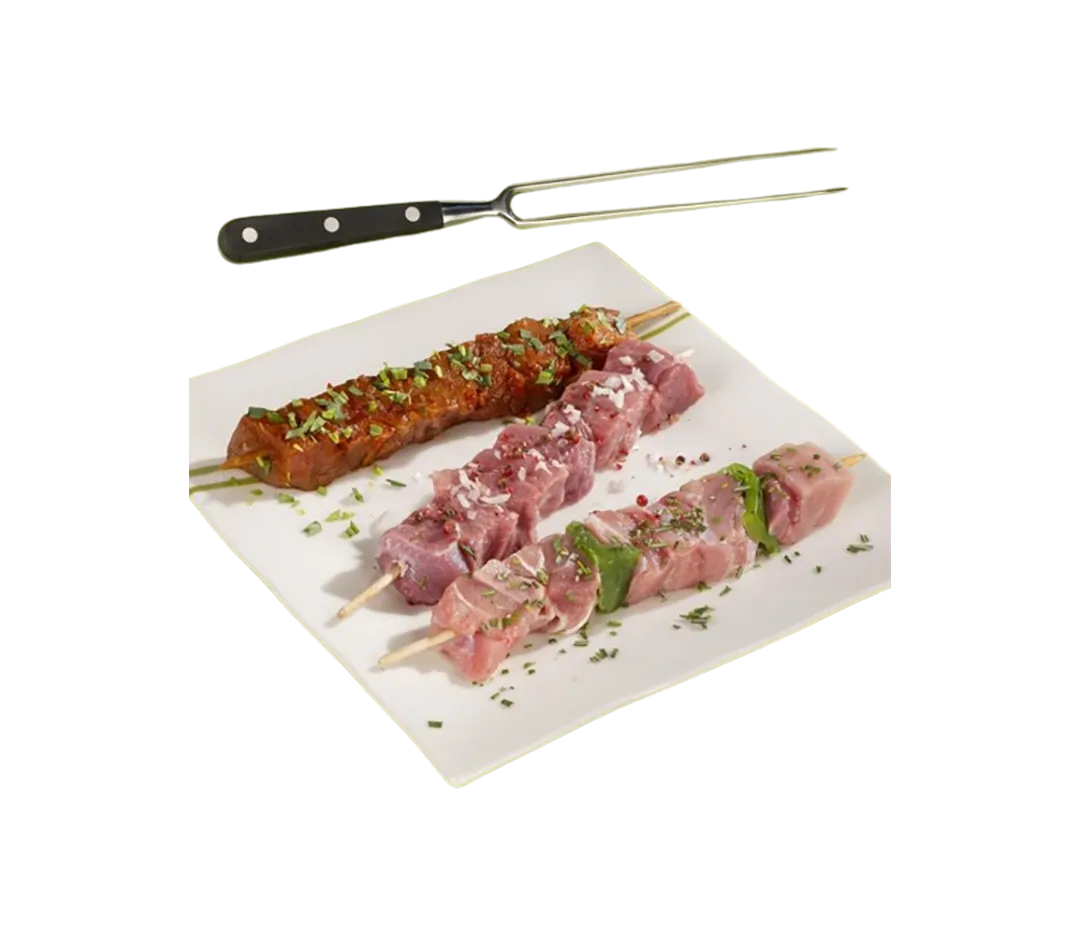 Cubes de viande de dinde enfilés sur un pique à brochette en bois, crus et origine France.