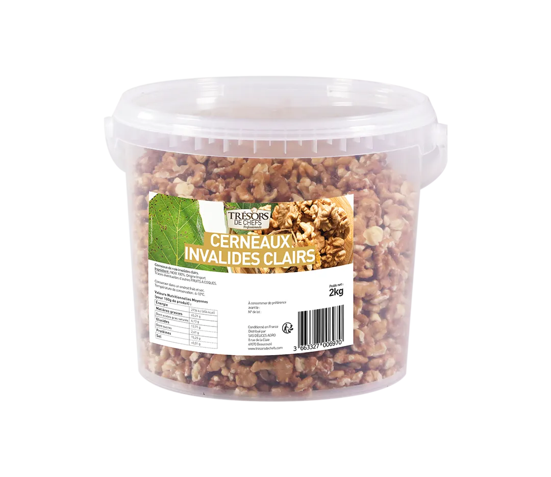 Les Cerneaux de Noix Invalides sont des morceaux de noix cassés ou irréguliers, parfaits pour des préparations culinaires comme les pâtisseries, les salades ou les garnitures. Riches en goût et en nutriments, ils sont une option économique et savoureuse. Idéals pour les professionnels cherchant qualité et praticité.