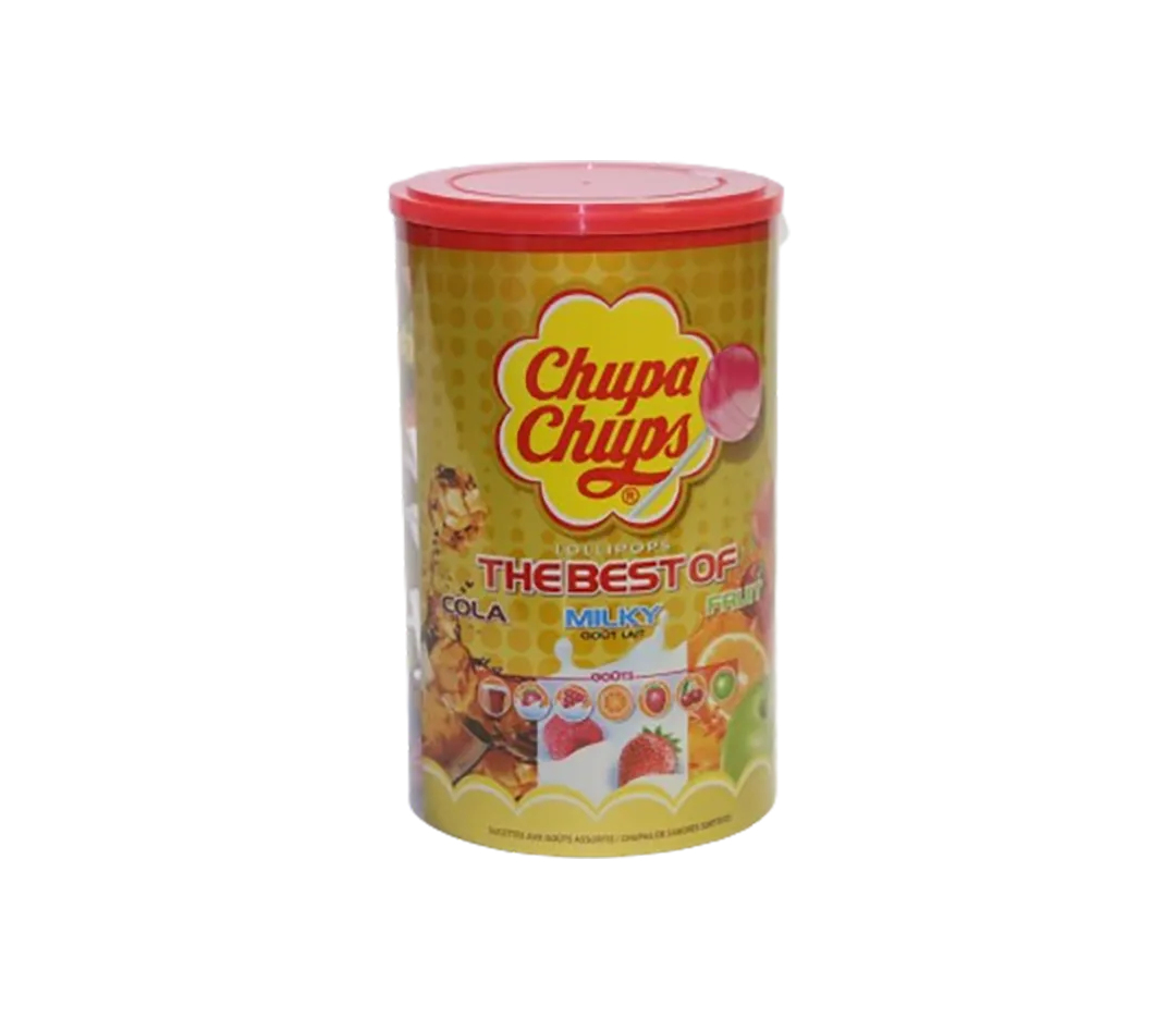 La boite Chupa Chups The best of, les plus célèbres goût des intemporelles Chupa Chups dans une seule et même boîte ! Goût fraise, orange, pomme, cerise, cola, lait fraise et lait framboise vanille.