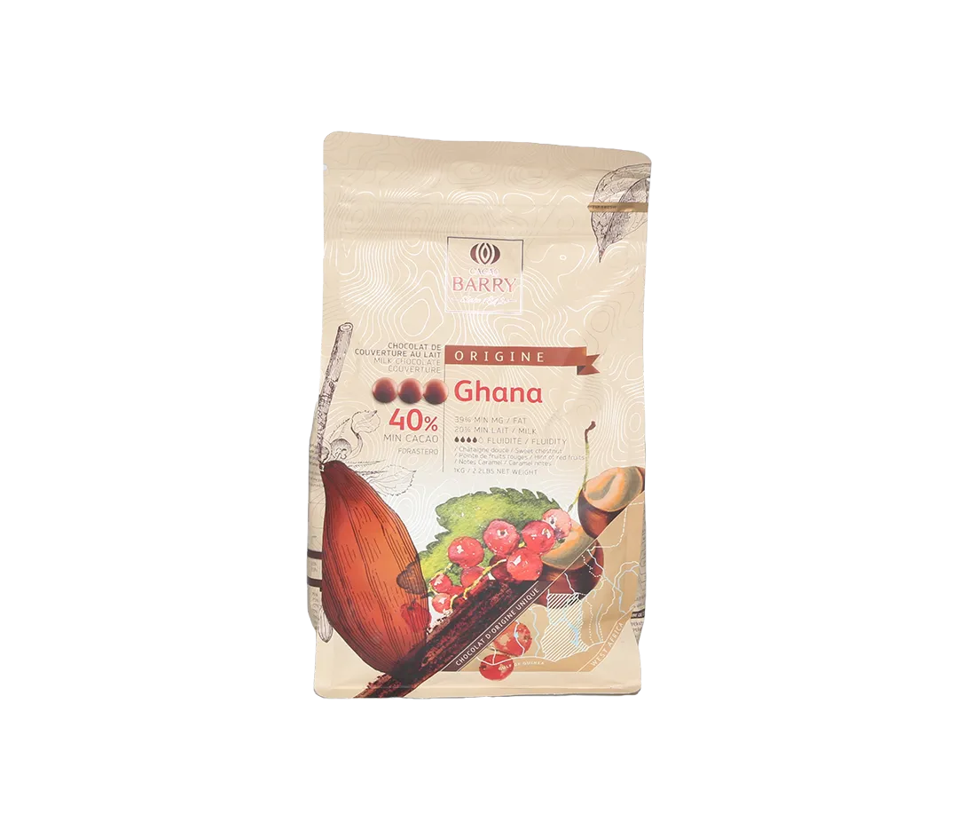 Ce chocolat de couverture au lait origine Ghana révèle des saveurs de fruits rouges et de châtaigne recouvertes par un cacao intense et de jolies notes biscuitées.