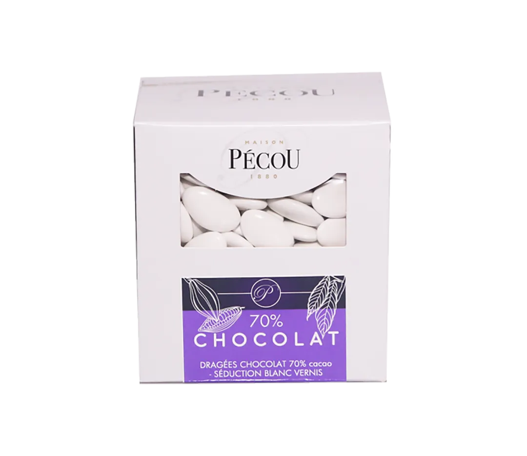 Ingrédients : chocolat à 70 % de cacao (65 %) (pâte de cacao, sucre, beurre de cacao, émulsifiant : lécithine (SOJA), arôme), sucre, épaississant : gomme arabique, amidon de riz, arôme naturel de vanille avec autres arômes naturels, colorants, agents d’enrobage : cire de carnauba, cire d’abeille.