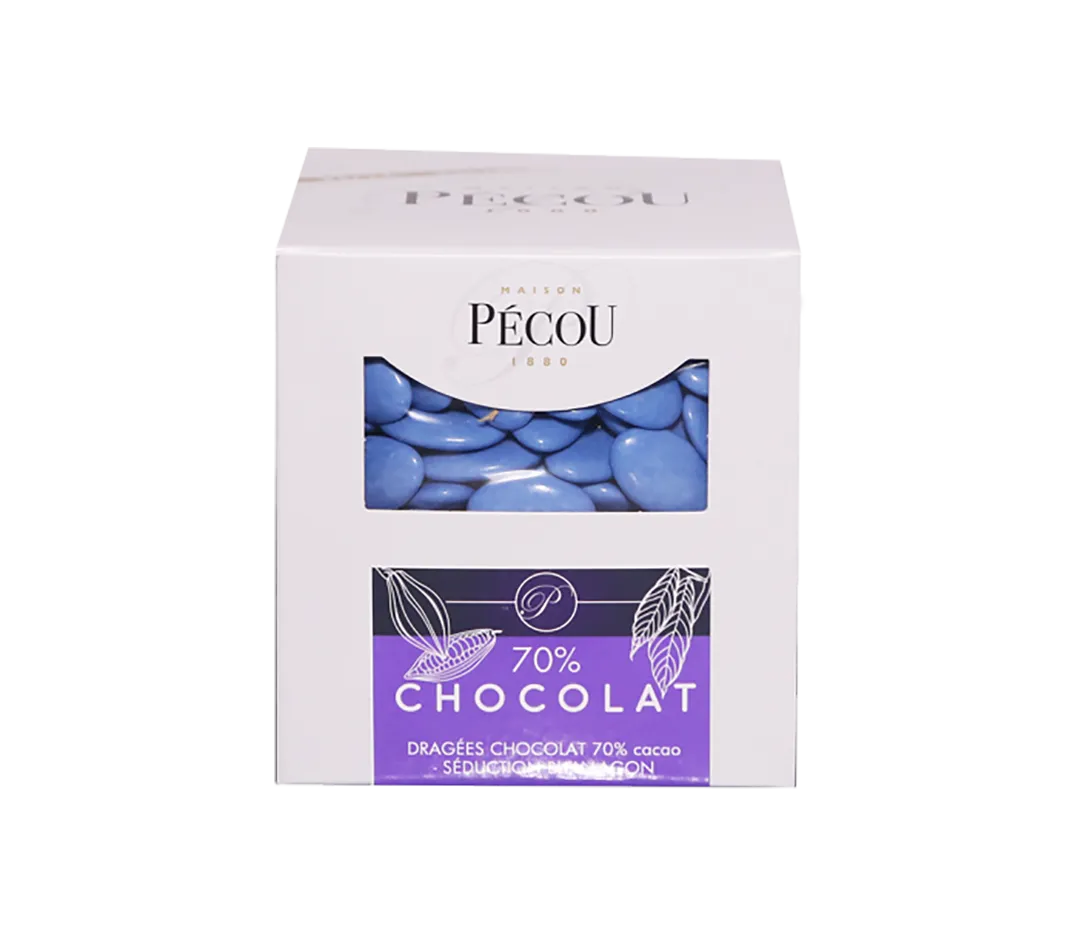 Ingrédients : chocolat à 70 % de cacao (65 %) (pâte de cacao, sucre, beurre de cacao, émulsifiant : lécithine (SOJA), arôme), sucre, épaississant : gomme arabique, amidon de riz, arôme naturel de vanille avec autres arômes naturels, colorants, agents d’enrobage : cire de carnauba, cire d’abeille.