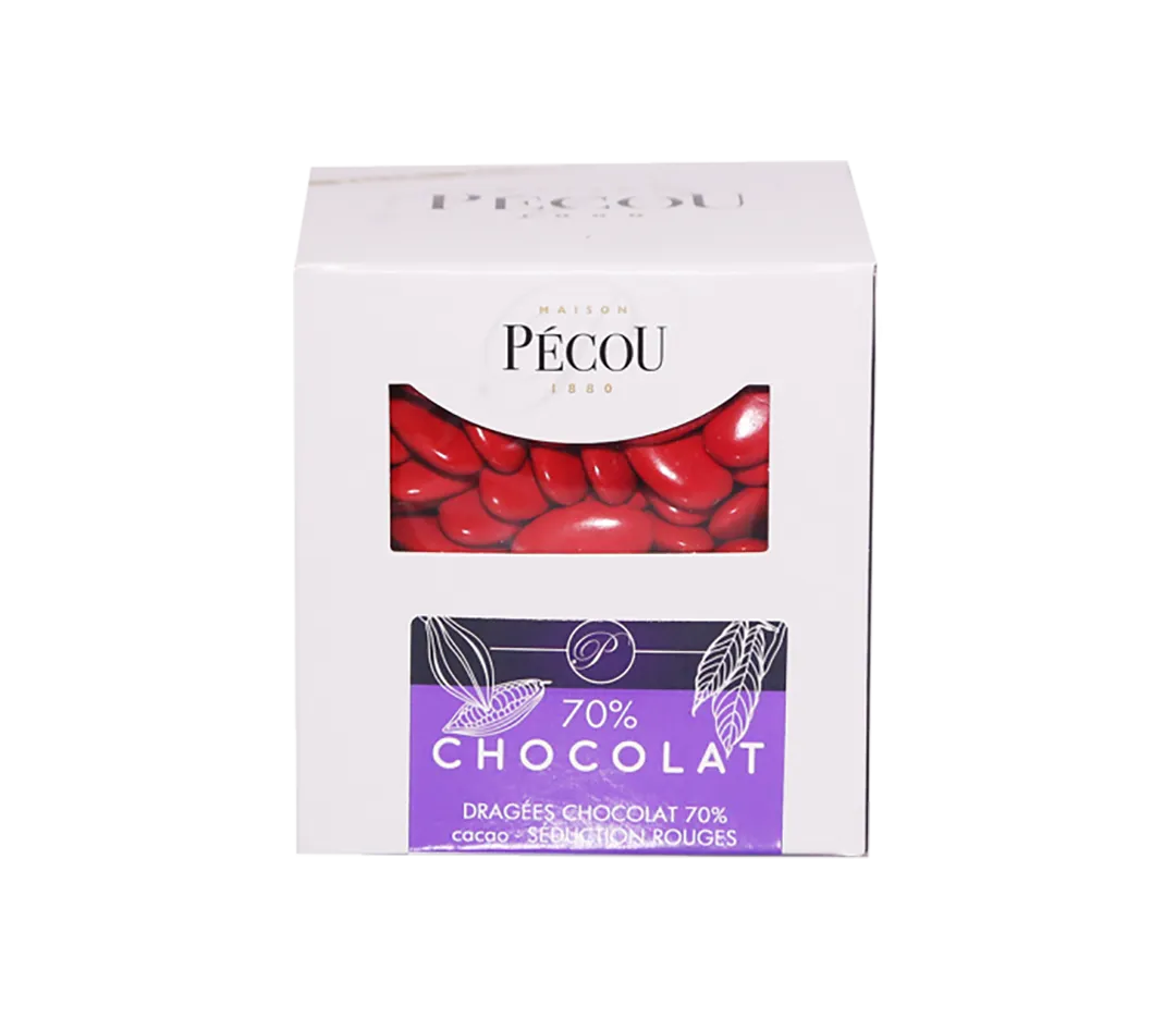 Ingrédients : chocolat à 70 % de cacao (65 %) (pâte de cacao, sucre, beurre de cacao, émulsifiant : lécithine (SOJA), arôme), sucre, épaississant : gomme arabique, amidon de riz, arôme naturel de vanille avec autres arômes naturels, colorants, agents d’enrobage : cire de carnauba, cire d’abeille.
