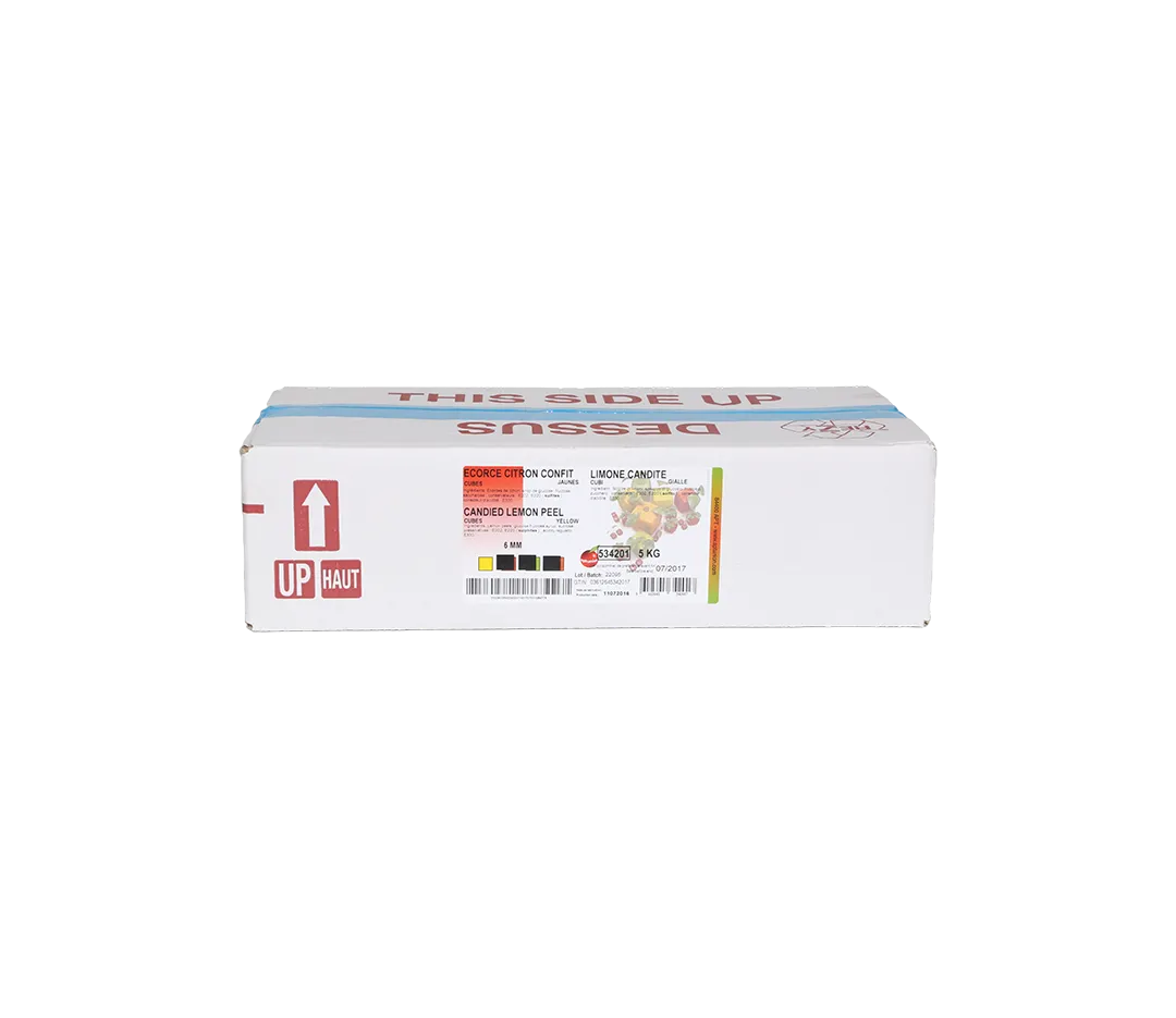 Prélevés sur des agrumes de premier choix, les zestes de citron sont découpés en cubes puis confits pour donner un produit final dont la qualité, le goût et l’apparence colorée sont de la plus haute qualité. Ces zestes d’agrumes ne contiennent ni colorants ni conservateurs.