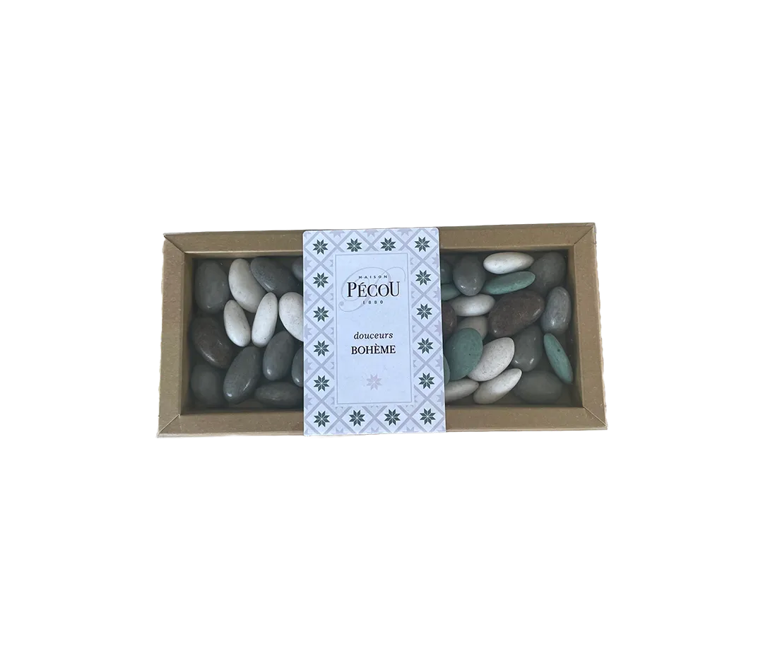 Ingrédients : chocolat à 70 % de cacao (pâte de cacao, sucre, beurre de cacao, émulsifiant : lécithine (SOJA), arôme), AMANDE, sucre, chocolat noir (pâte de cacao, sucre, beurre de cacao, émulsifiant : lécithine (SOJA)), poudre de cacao, épaississant : gomme arabique, amidon de riz, arôme naturel de vanille avec autres arômes naturels, colorants : rouge de betterave, curcumine, spiruline, oxydes de fer [nano], charbon végétal, agents d’enrobage : cire de carnauba, cire d'abeille.