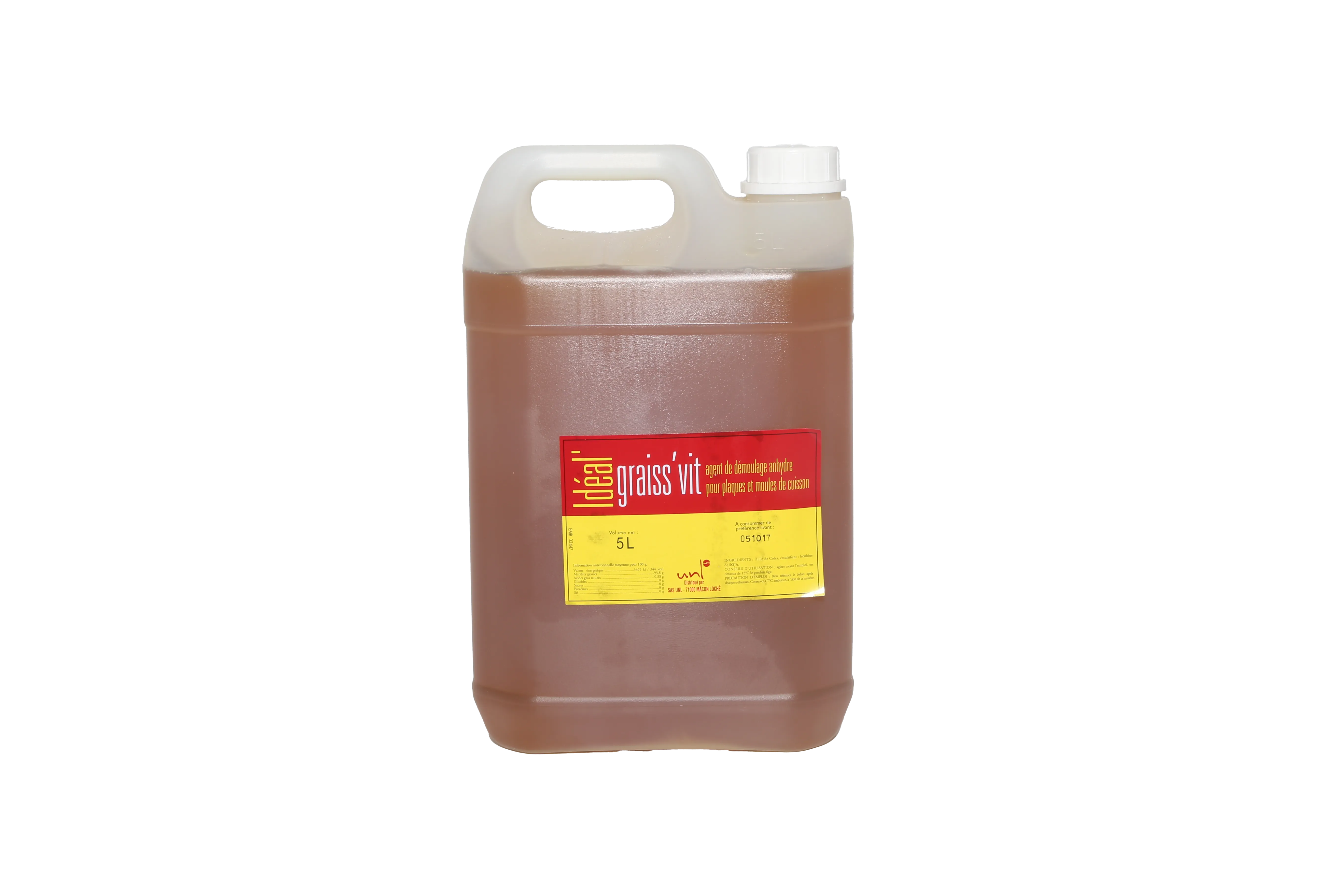 Utilisation du produit : GRAISS’VIT IDEAL’ est un agent de démoulage pour plaques et moules de cuisson constitué d'huile végétale de haute qualité, il est destiné aux utilisateurs professionnels.