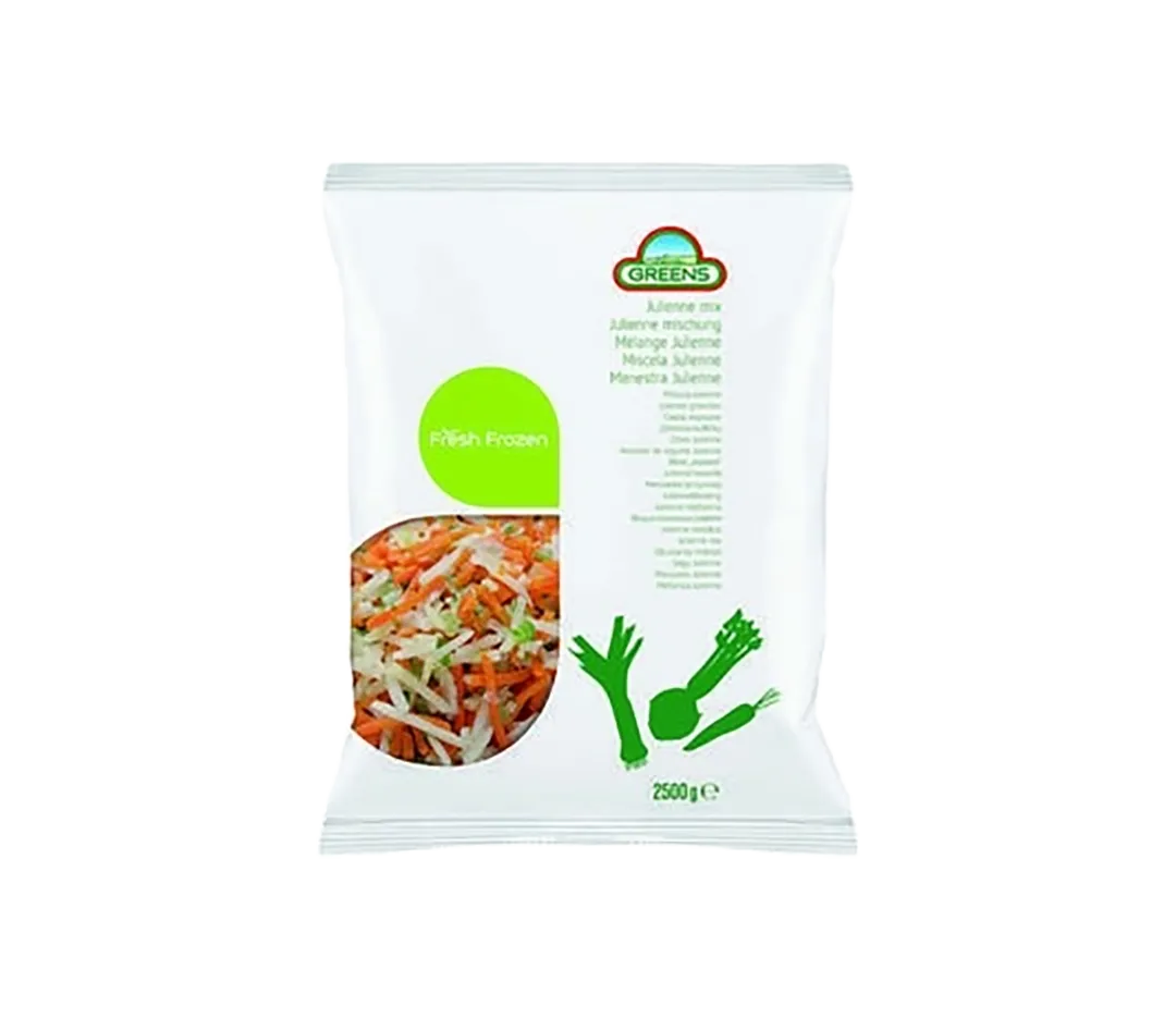 Mélange de 40% de céleri-rave en julienne, 20% de poireaux en cubes et 40% de lanières de carottes.