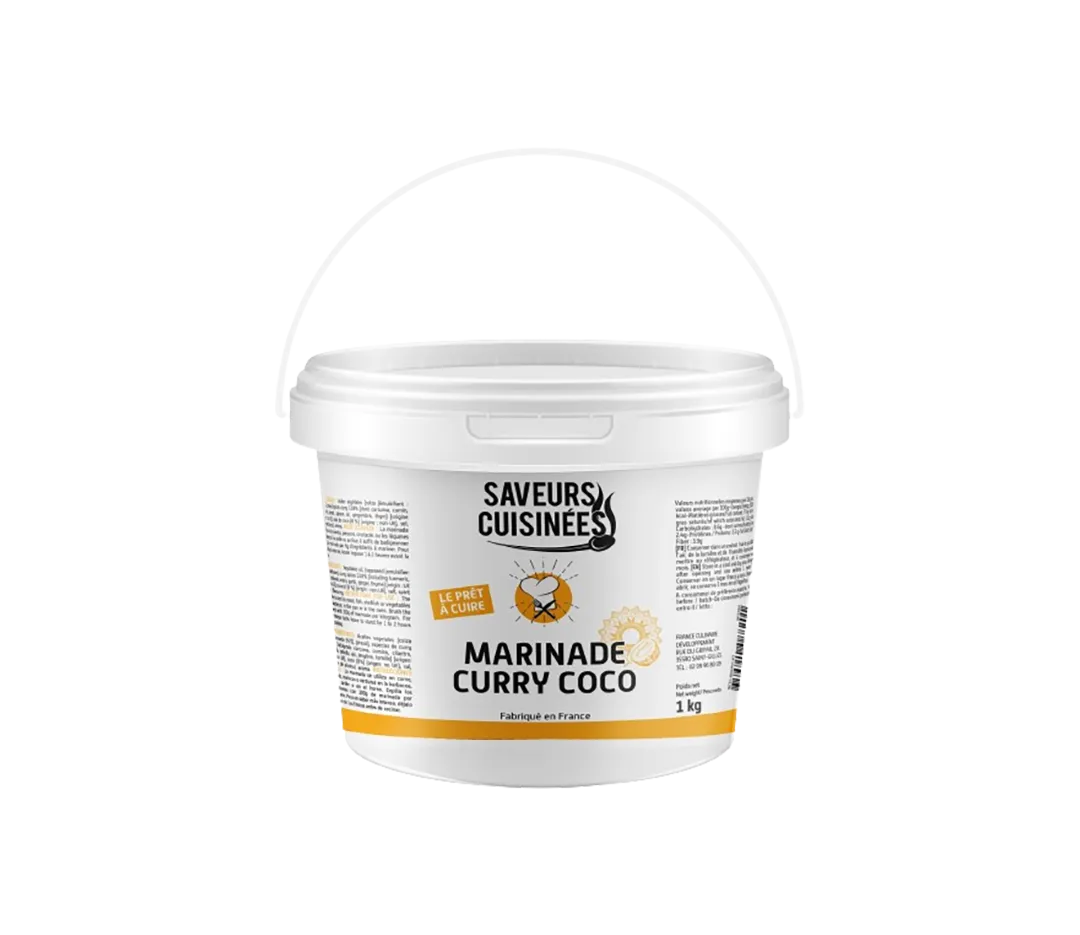 La marinade curry coco liquide est une spécialité aromatique prête à l’emploi. Elle s’utilise en barattage, enrobage, à la poêle, au barbecue ou au four, sur viandes, poissons, légumes et crustacés et sans ajout de matière grasse supplémentaire.