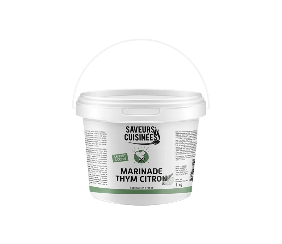 La marinade thym citron est une spécialité aromatique prête à l’emploi. Elle s’utilise en barattage, en enrobage sur viandes, poissons, légumes et crustacés.