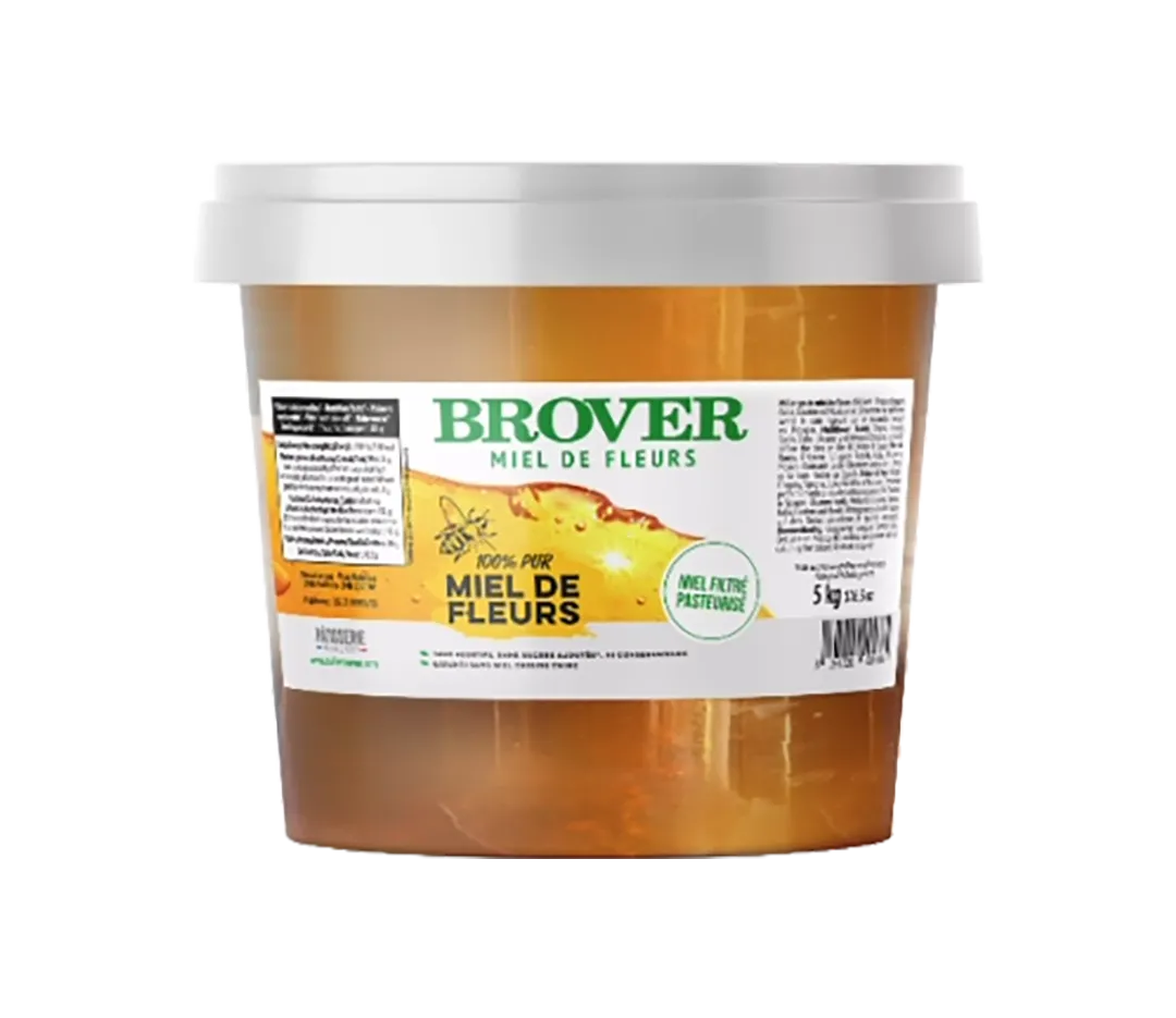Un miel de fleurs de couleur ambre clair, doux et très fluide. Garanti sans miel origine Chine, filtré et pasteurisé pour un usage professionnel