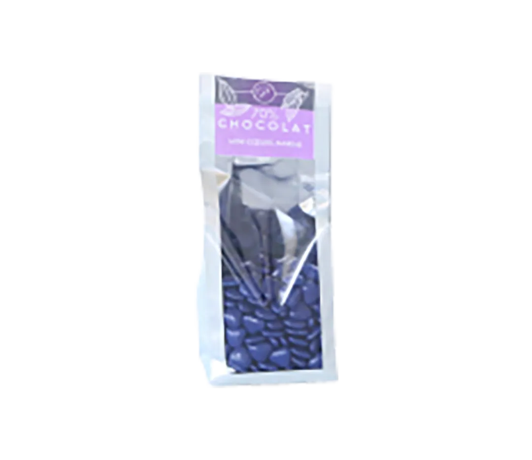 Ingrédients : chocolat à 70 % de cacao (65 %) (pâte de cacao, sucre, beurre de cacao, émulsifiant : lécithine (SOJA), arôme), sucre, épaississant : gomme arabique, amidon de riz, arôme naturel de vanille avec autres arômes naturels, colorants, agents d’enrobage : cire de carnauba, cire d’abeille.
