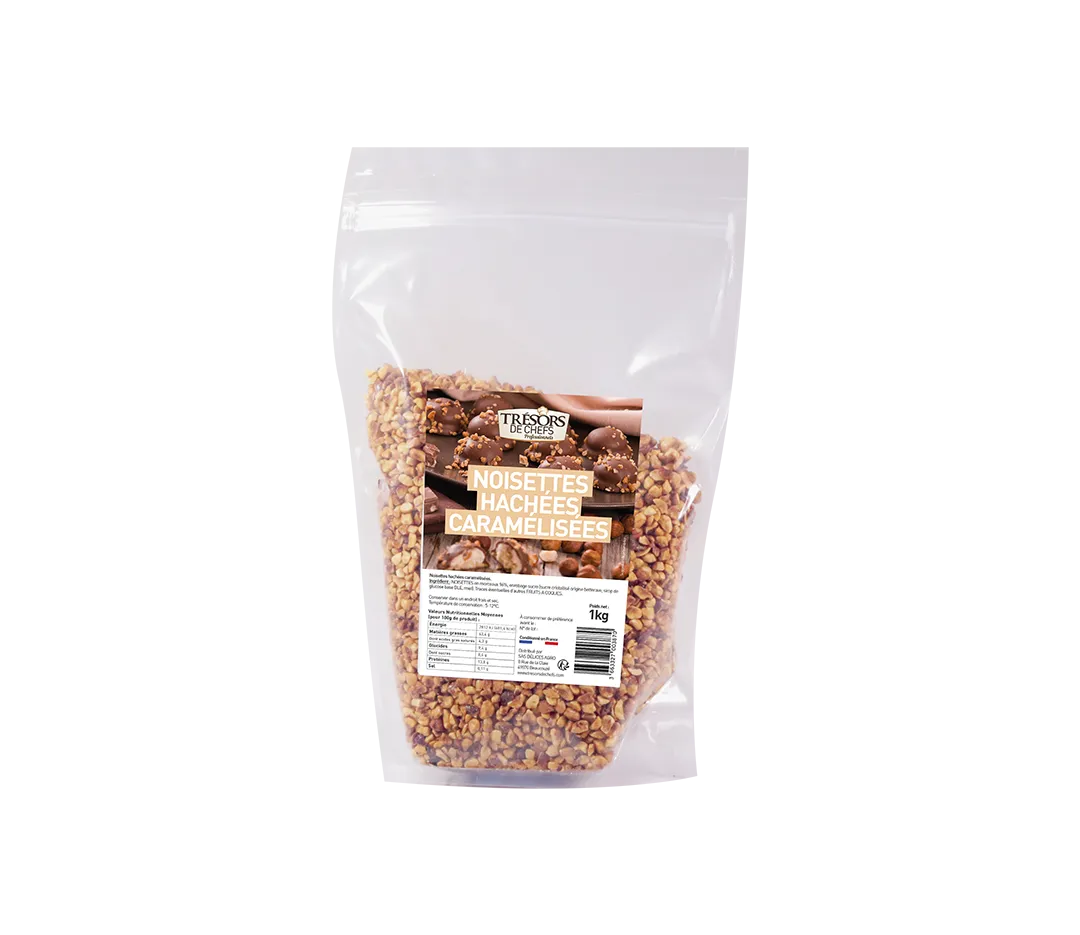 Morceaux de noisettes grillées et caramélisées puis calibrées entre 4 et 8 mm.