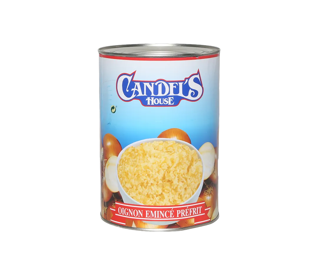 Conserves d'oignons sains, pelés, coupés et frits à l'huile de tournesol, avec du sel et de l'acide citrique conservés en récipients hermétiques adaptés aux méthodes de pasteurisation.