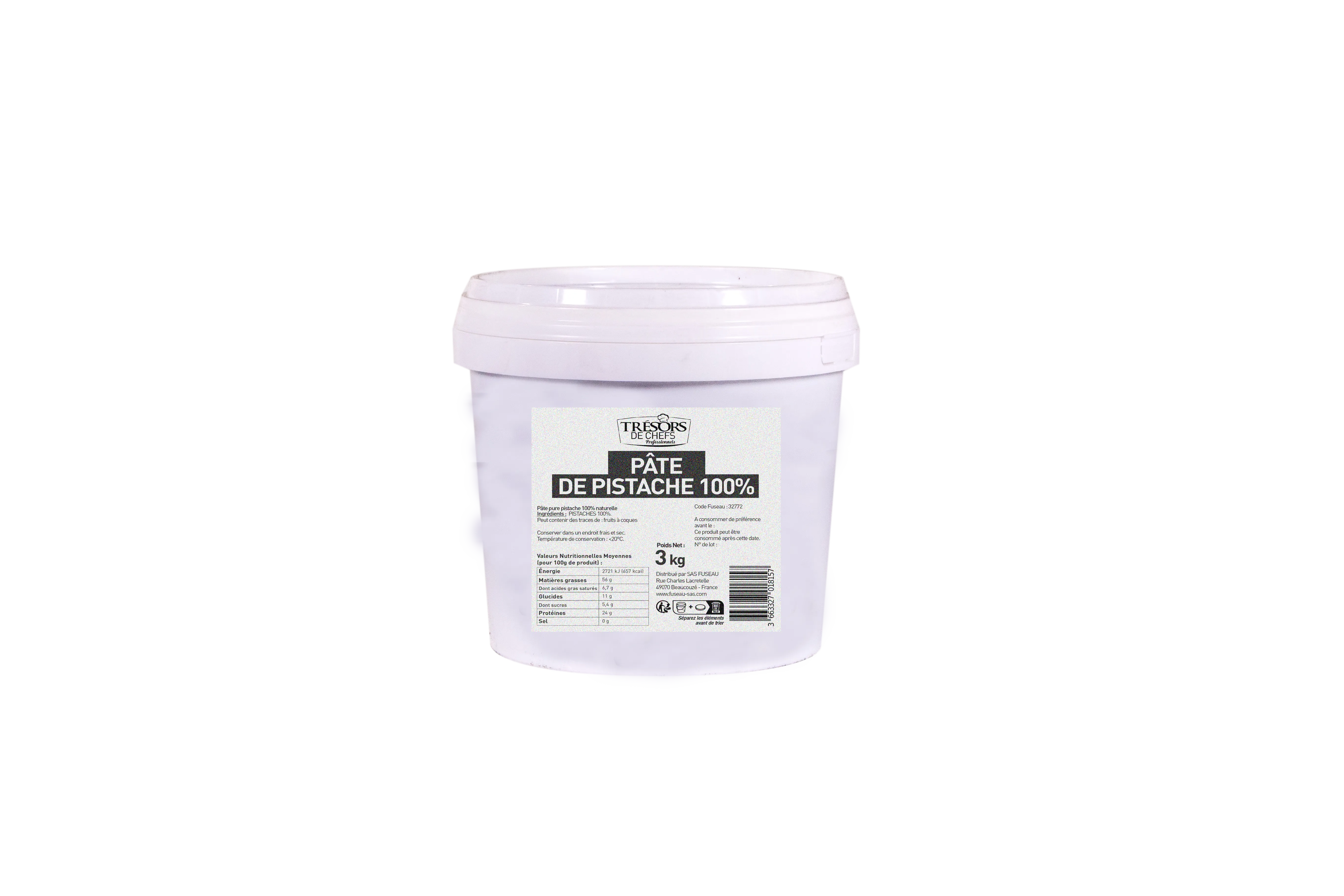Pâte lisse et fluide obtenue par broyage de pistache, c'est une pâte pure faite avec un % plus élevé de pistache épluchée, puis caractérisée par une couleur verdâtre, un niveau de torréfaction plus élevé