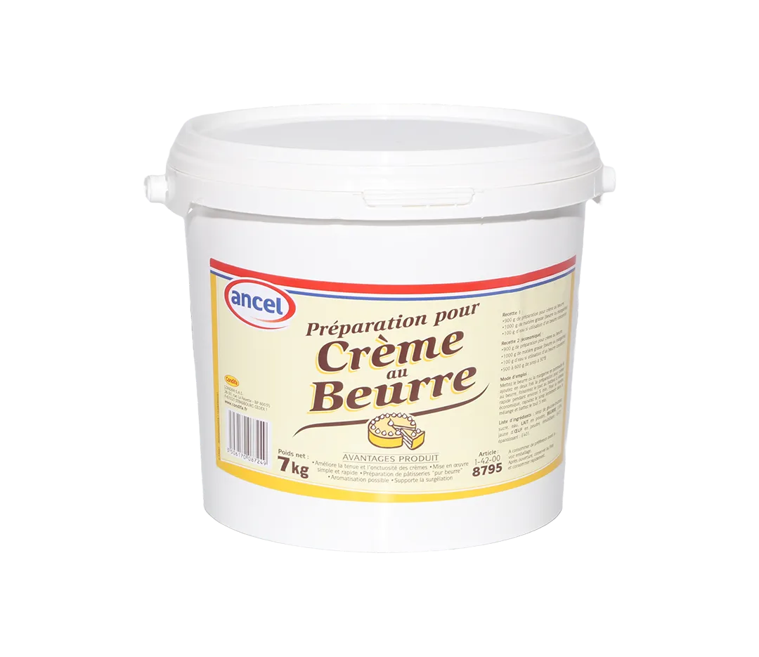 Recette économique : 900 g de préparation pour crème au beurre + 1000 g de matière grasse (beurre ou margarine), + 100 g d’eau (si utilisation d’un beurre concentré) + 500 à 600 g de sirop à 30°B.