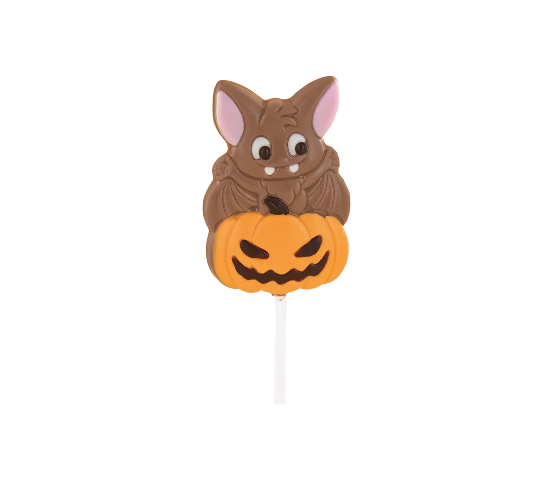 Sucette Chauve-souris Victor sur citrouille, chocolat au lait coloré, pièces de 25g
