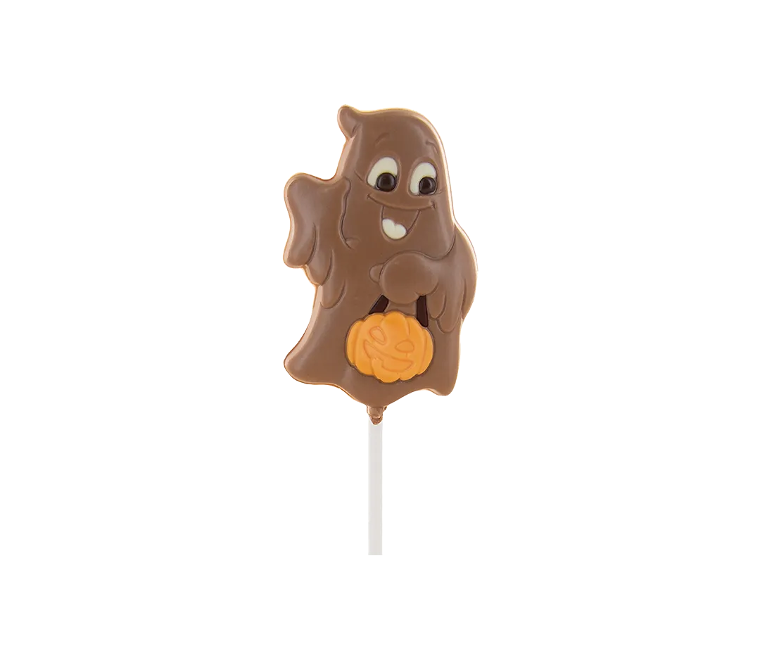 Sucette Fantôme Boo, assortiment chocolat au lait et blanc décoré et confiserie colorée.