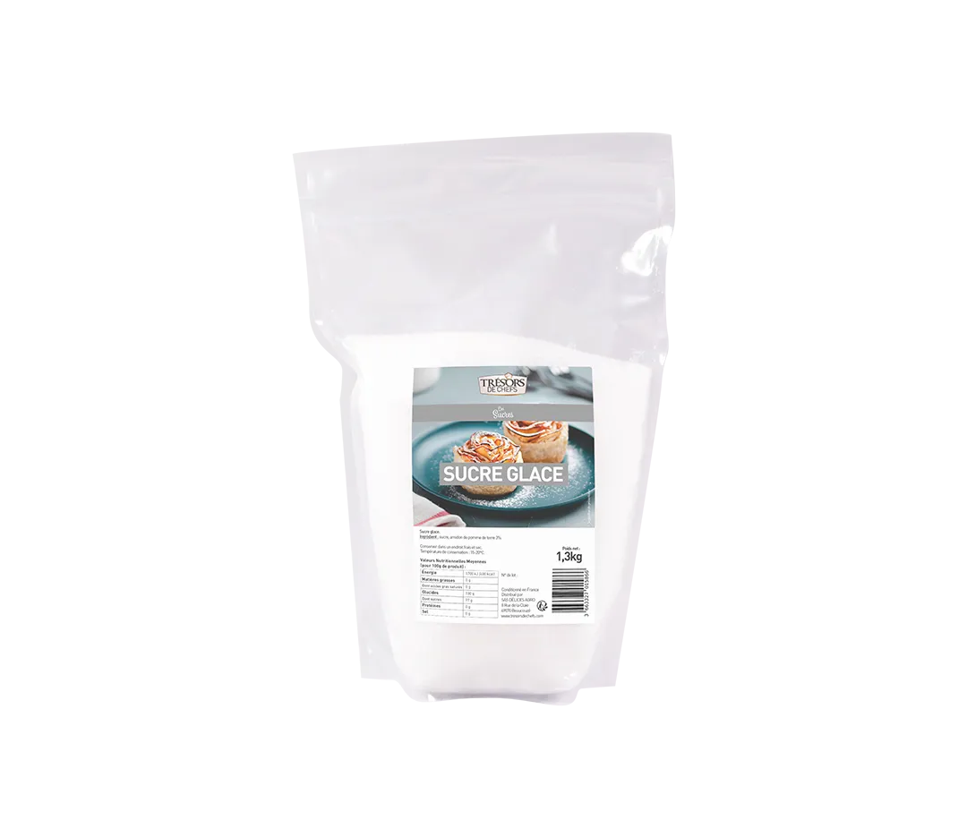 Le sucre glace Trésor de Chef en sachet de 1,3 kg est un sucre d'une finesse exceptionnelle, conçu pour apporter une texture lisse et une douceur délicate à toutes vos créations pâtissières. Idéal pour saupoudrer les gâteaux, pâtisseries, et viennoiseries, il s'intègre aussi parfaitement dans la confection de glaçages, ganaches, crèmes, et mousses. Sa poudre fine permet une dissolution rapide, ce qui en fait un allié incontournable pour les finitions et décorations sans laisser de grains. Le sachet refermable de 1,3 kg garantit une conservation optimale, préservant toute la fraîcheur du sucre pour des utilisations répétées en cuisine.