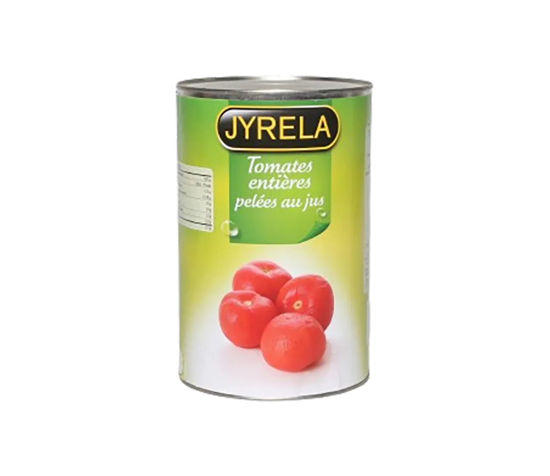 Conserve de tomates entières pelées au jus de tomate, qualité première, élaborées à partir de tomates fraîches et saines et de couleur rouge uniforme des différentes variétés de l'espèce Lycopersicum esculentum. Les tomates sont lavées, inspectées, pelées (thermo-physique) et conditionnées en boîtes hermétiques serties avec addition de jus de tomate.